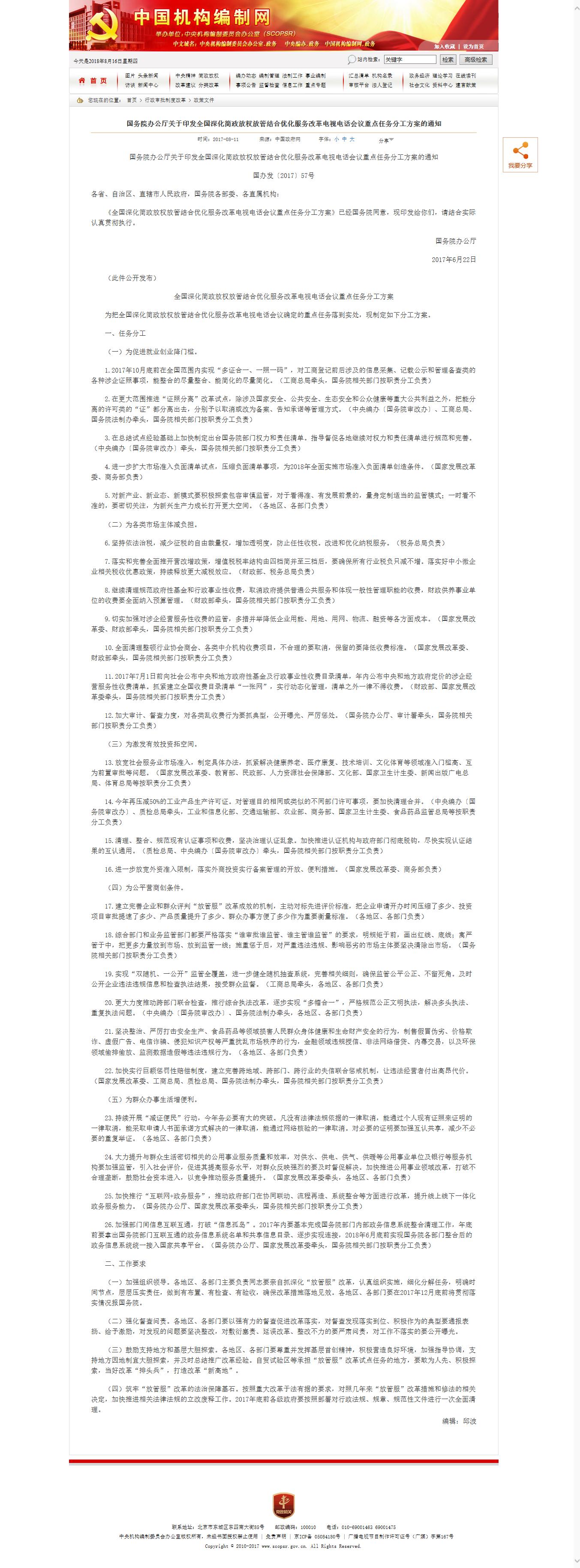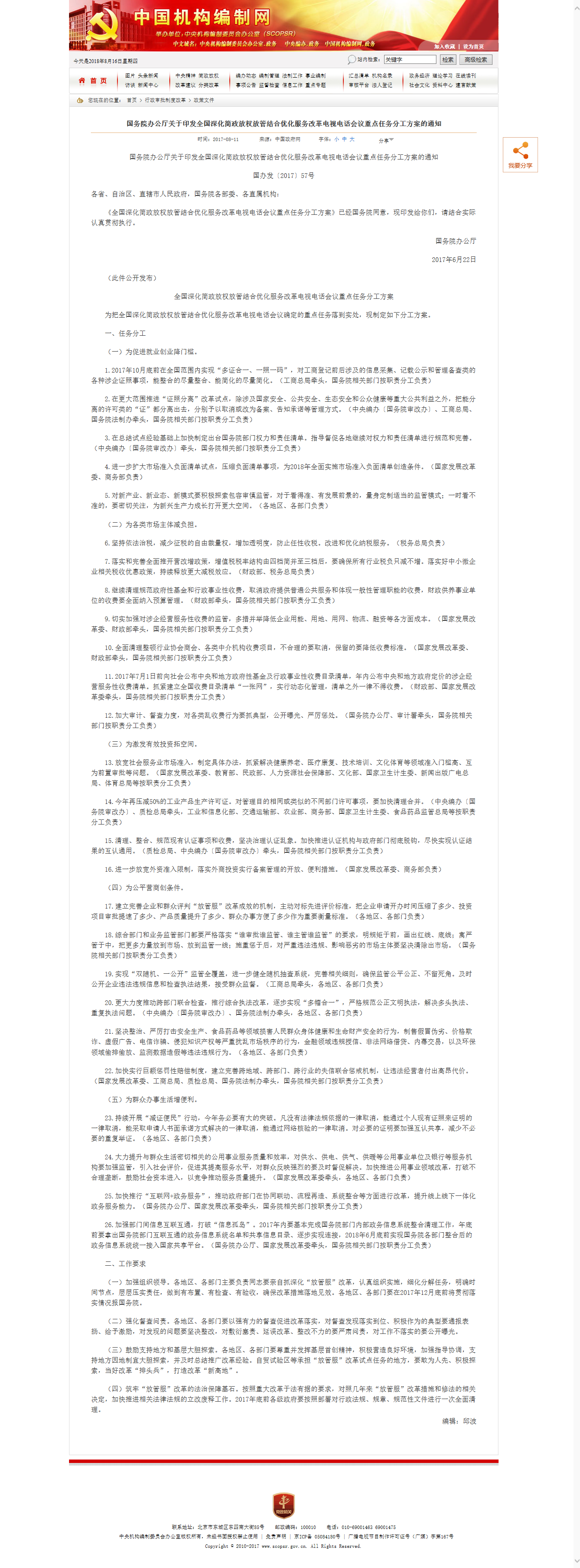 國務(wù)院辦公廳關(guān)于印發(fā)全國深化簡政放權(quán)放管結(jié)合優(yōu)化服務(wù)改革電視電話會議重點任務(wù)分工方案的通知